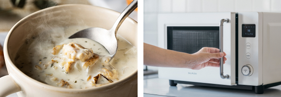 上質なデザインとシンプルな操作性、楽器が奏でる心地よいサウンドにより、いつもの調理が楽しいひとときに変わります。ブイヤベースやローストチキンなどの定番料理から、ケーキなどのテーブルが華やぐスイーツまで。直感的でシンプルなダイヤル操作で、迷うことなくお使いいただけます。