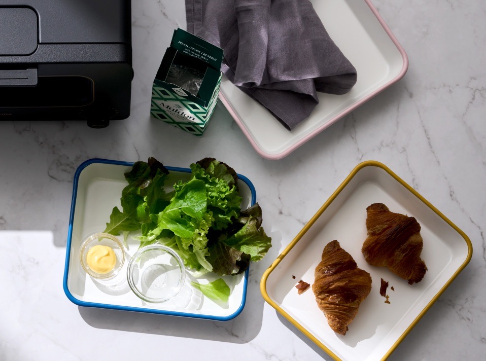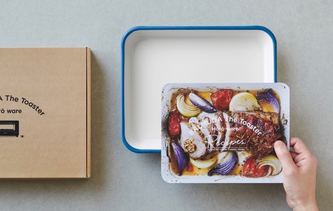 琺瑯バットを使えば、料理の下ごしらえからオーブン調理まで、パンを焼く以外のシーンでもトースターが幅広く活躍します。発売10周年を記念したロゴ⼊りで、特別カラー「ピンク・ブルー・キャメル」のいずれか1枚をプレゼントいたします。