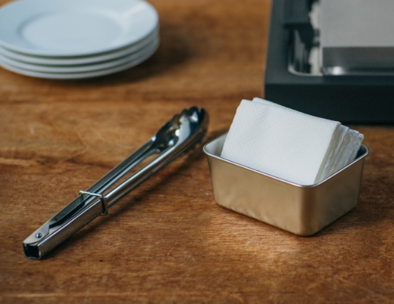 ヘラやお箸など料理ごとに必要な調理器具の他に、小さく折り畳んだキッチンペーパーがあると便利。プレート上の食材の水分や油を拭き取るなどに活用できます。さらにトングがあれば、手を汚さずに水分や油を拭き取れます。使用済みのキッチンペーパーを捨てられる小さなごみ箱などが手近にあると安心です。