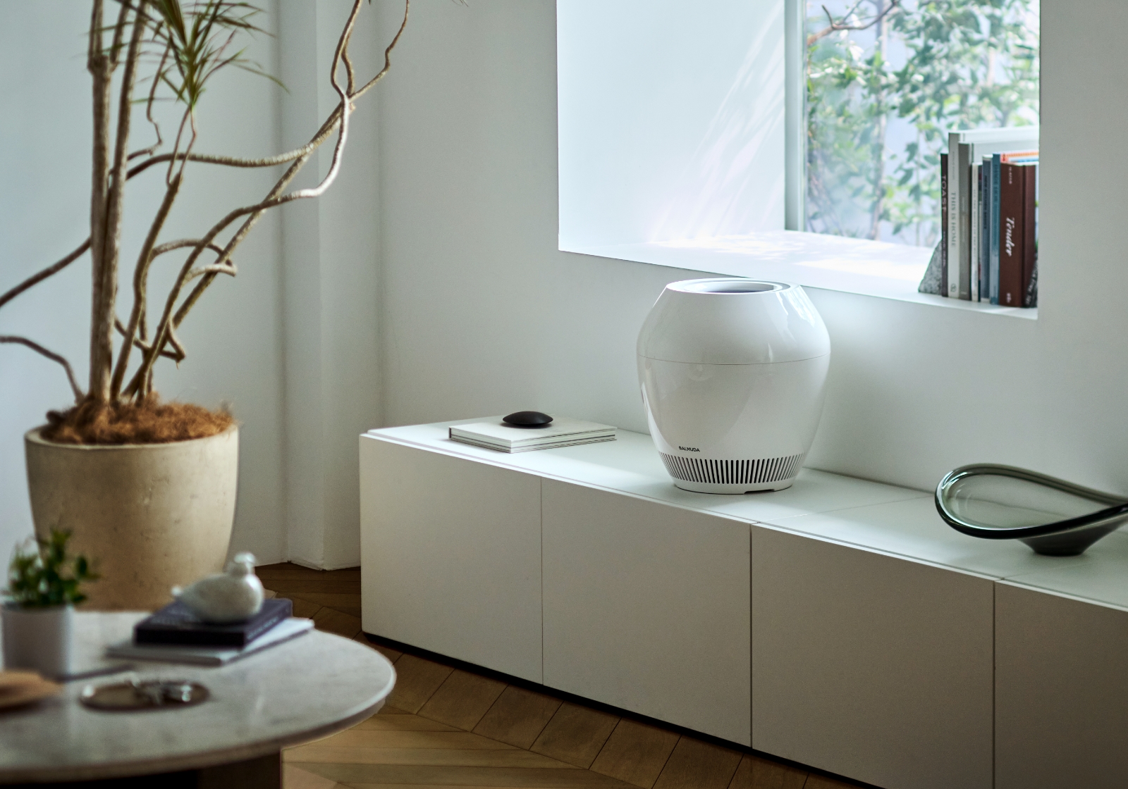 現代の生活空間を理想的な湿度に保つ道具は、どんな姿であるべきか。Rainのクラシックでモダンな形は、花器や壺から着想を得て、空間に自然になじむようデザインされています。タンクレス構造で、給水は上から注ぐだけ。刷新されたディスプレイと光が、日々の給水や操作に応じて、心地よく変化します。