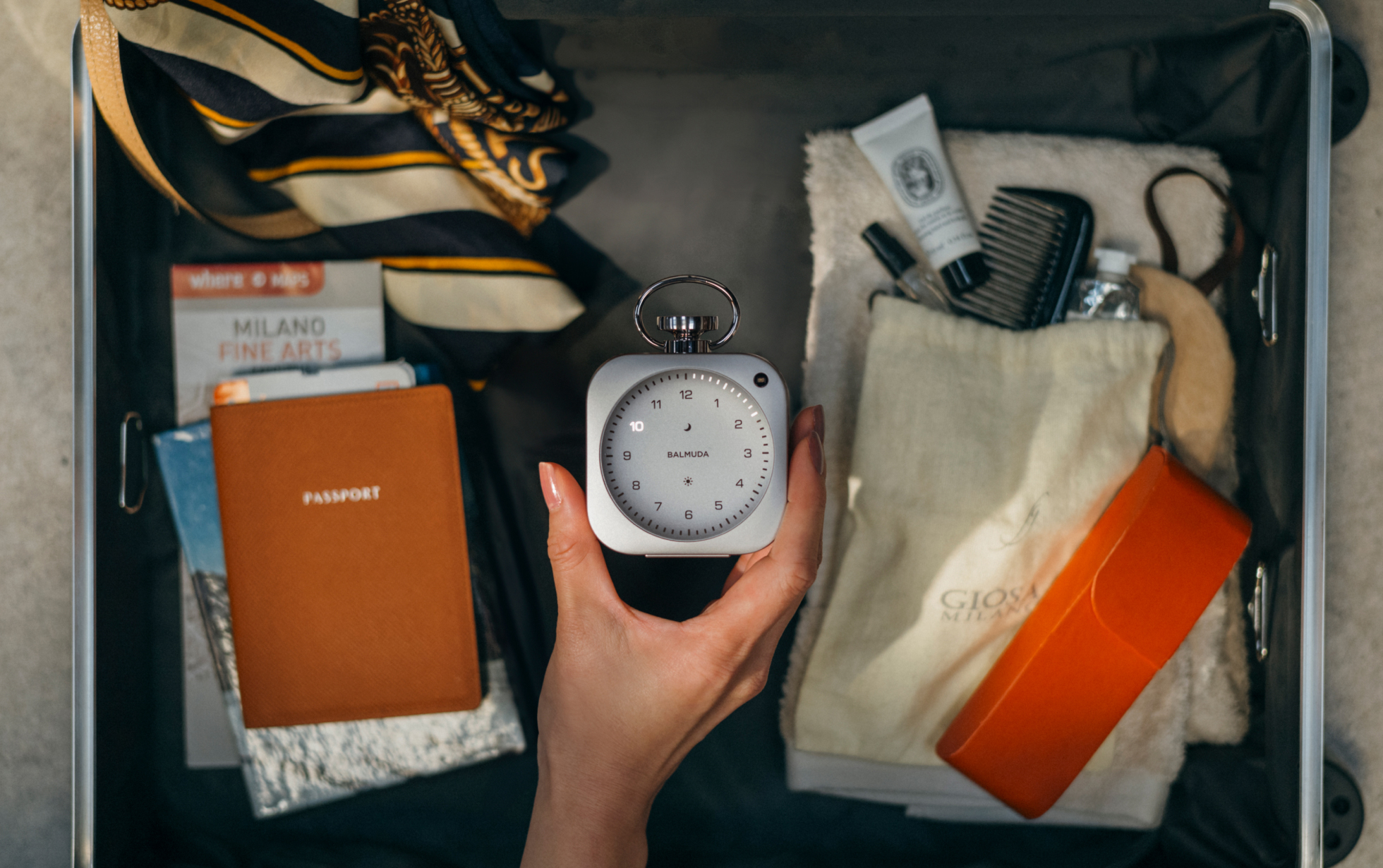 アルミニウムのブロックから、精密に削り出されたバルミューダのクロック。優しく鳴り始めるアラームや、夜のひとときを落ち着きの時間に変える“Relax Time”など、1日を通じて良い時間を過ごしていただくためにデザインされました。専用アプリBALMUDA Connectとの連携でより便利に、自分好みの設定に。さまざまな場所に持ち運べるよう、布製の収納袋が付属されています。
