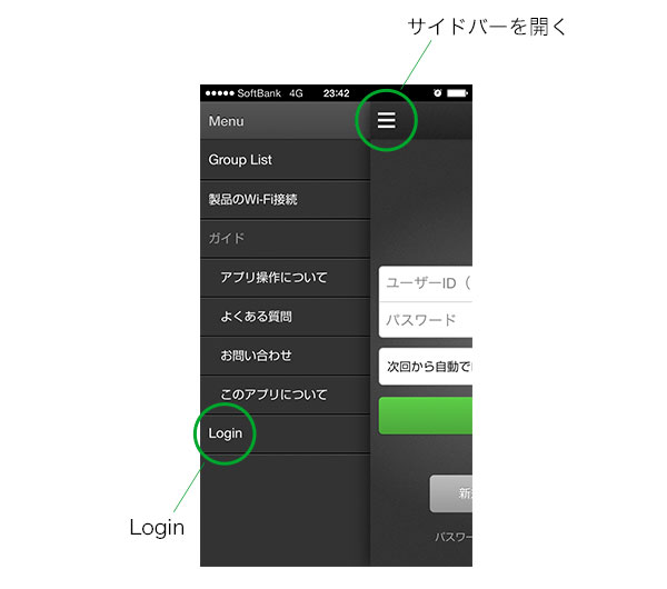 アプリを起動し、サイドメニューの「Login」をクリックします。