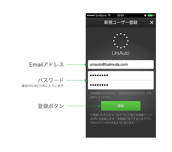 UniAutoサービスをお使いいただくにはユーザー登録が必要です。ユーザー登録に必要なのはメールを受信可能なEmailアドレスと、任意のパスワードだけです。製品にユーザーIDを登録(ユーザー認証)することで、UniAutoアプリから製品の操作が可能になります。