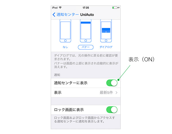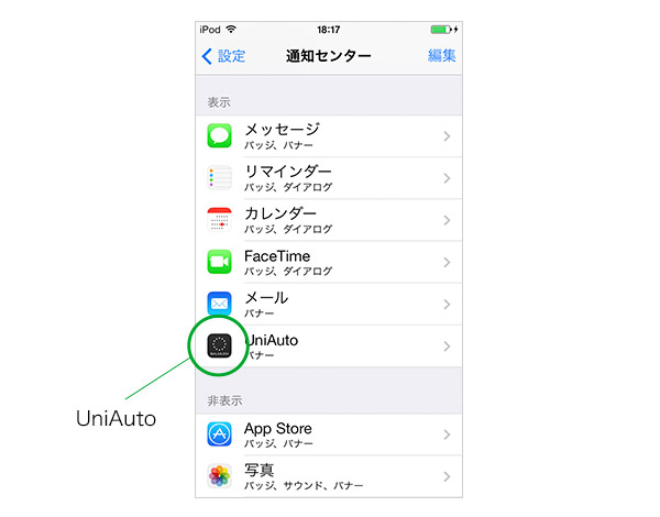 通知センターに表示されない場合は、iPhoneの[設定] > [通知センター]からUniAutoアプリを選び、「通知センターに表示」が有効に設定されていることをご確認ください。